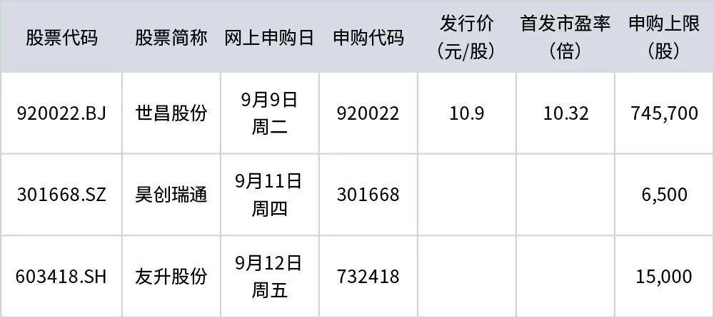 据目前安排,若无变化,下周(9月8日至12日)有3只新股可申购,分别为创业板1只、沪市主板1只和北交所1只。