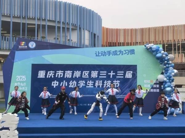 科技节启动仪式上,来自隆鑫通用的机器人小鑫还和学生代表们共同演绎了一段别开生面的“科技舞蹈”,将现场气氛带向了高潮。在特色项目展区,来自南岸区27个中小学科学教育实验校和区域支持单位通过生动的演示和趣味互动,集中展现了南岸区中小学生蓬勃的科技创新活力。